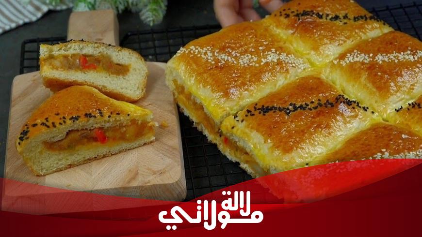 من مطبخ سفيرة الطبخ أم انوار/ مكونات العجينة كوب الا ربع ماء دافئ 2 ملعقة كبيرة سكر 1 ملعقة كبيرة خميرة ثلث كوب زيت 3 ملعقة كبيرة زبادي بياض بيضة و الصفار نحتفظ به لدهن الوجه 3 ونصف كوب دقيق 1 ملعقة صغيرة ملح مكونات الحشوة 3 حبات بطاطس متوسطة 4 ملعقة كبيرة زيت 1 بصلة متوسطة فلفل رومي 1 ملعقة صغيرة ثوم مهروس 1 ملعقة صغيرة ملح نصف ملعقة صغيرة فلفل اسود 1 ملعقة كبيرة كزبرة يابسة 1 ملعقة كبيرة بابريكا الصينية مقاس 25 × 40 الخبز على حرارة 200 مدة 20 دقيقة.
