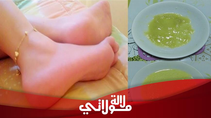 قومي سيدتي بخلط ملعقة من كريم الفازلين مع ملعقة من زيت الصبار وملعقة الياغورت وملعقة من بيكاربونات الصودا واخلطي جيدا ثم طبقي الوصفة على أقدامك ثم البسي كيسا بلاستيكيا واتركي الخلطة مدة ساعة بعدها اشطفي وسترين النتيجة من أول مرة .