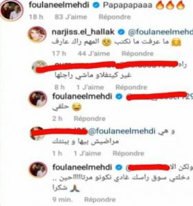 ودونت السيدة تعليقها الذي جاء بطريقة متعصبة في إحدى صور الفنانة نرجس الحلاق، من خلال نشرها فيديو عبارة عن إشهار لبعض الملابس التقليدية، ليعلق مهدي بطريقة كوميدية على هذا المنشور، إلا أن تعليق هذه المرأة لم يكن في الحسبان حيث علقت قائلة: “..هي مراضيش ببنتك ومرتك”، بعد حوار وغزل دار بين تعليقات كل من نرجس ومهدي.