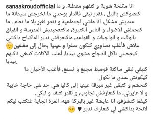 ونشرت سناء صورة لها عبر حسابها بالأنستغرام قبل ساعات قليلة وأرفقتها بتدوينة مطولة قالت من خلالها: ” أنا مكلخة شوية وكنفهم معطلة، ماكنصوكش فالليل، نقدر نبقى فالدار بوحدي مانخرجش سيمانة ماعنديش مشكل، أنا ماشي اجتماعية ونقدر نغبر بلا مانعلم، ماكنحملش الأضواء والناس الكثيرة، ماكاتعجبنيش المدرسة والفياق بالوقت والواجبات والقواعد”.