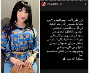 أعلنت الفنانة المغربية دنيا بطمة على القرار الذي اتخذته يوم أمس الإثنين بمناسبة “عرفة”، حيث شاركت متابعيها أنها لن تغفر لأي أحد قام بظلمها.