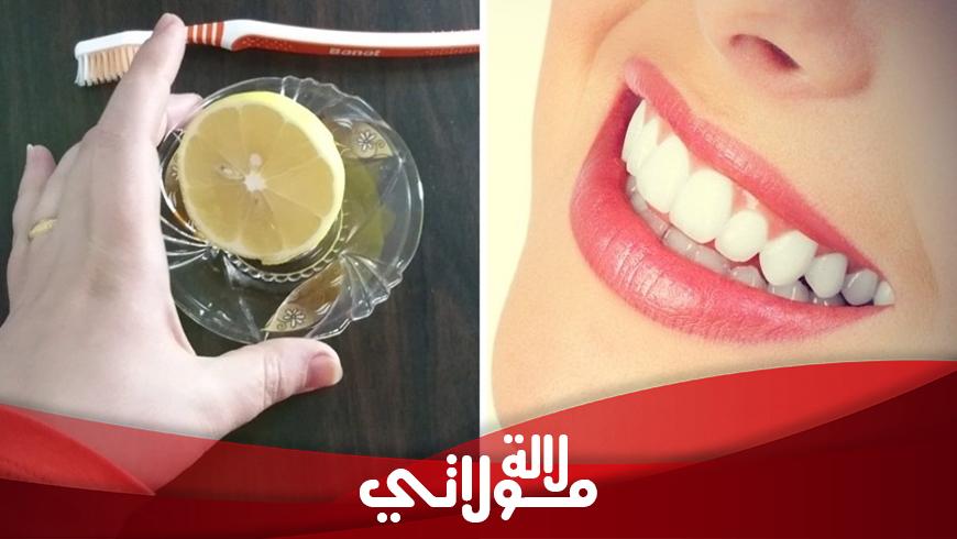 الليمون:يعتبر استخدام عصير الليمون من الطرق السهلة والرخيصة والمتوفرة في كل مطبخ للحصول على أسنان بيضاء، فعصير الليمون يساعد على إزالة الطبقة الصفراء من الأسنان والحصول على أسنان بيضاء، فقط قومي بالمضمضة بعصير الليمون بعد الانتهاء من غسل أسنانك يوميا ولمدة أسبوع ولاحظي الفرق المذهل بنفسك.