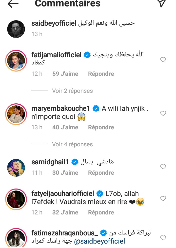 وتفاعل عدد كبير من الفنانين والمشاهير المغاربة مع هذا المنشور وقالت فاتي جمالي في هذا الصدد: “الله يحفظك وينجيك كمغاد”، وبدوره الإعلامي صامد غيلان عبر عن غضبه الشديد بسبب هذا الإشاعات المتكررة وقال: “هادشي بسال”٠