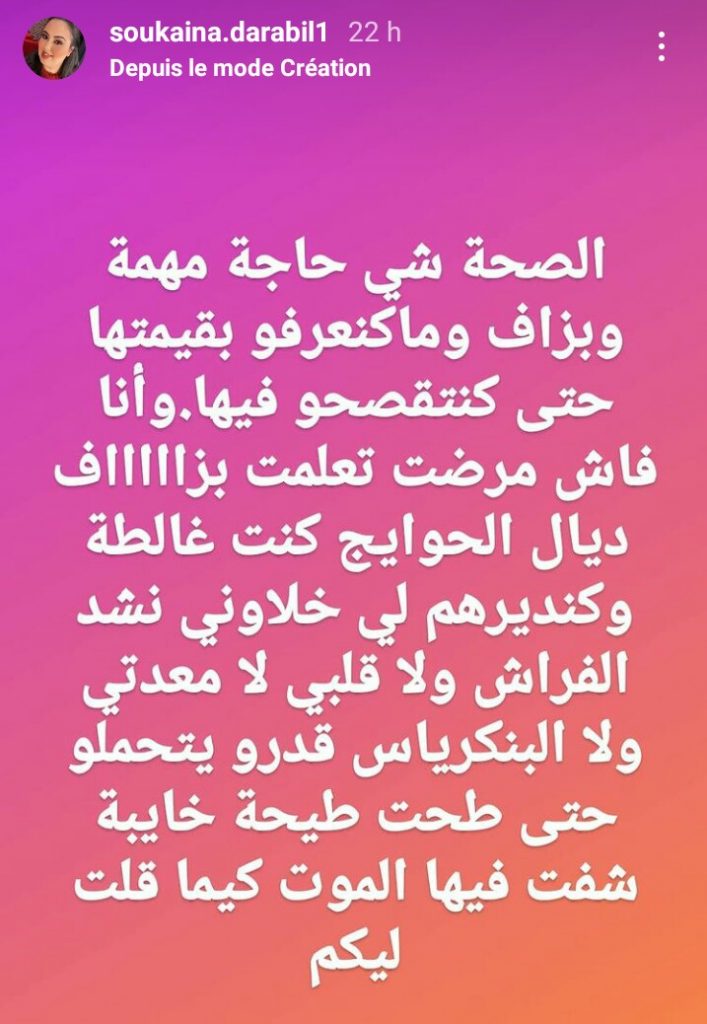 وأضافت في نفس السياق: “الصحة شي حاجة مهمة وبزاف ماكانعررفو بقيمتها حتى كنقصحو فيها وأنا فاش مرضت تعلمت بزاف ديال لحوايج كنت غالطة وكنديرهوم لي خلاوني نشد الفراش ولا قلبي ومعدتي ولا البنكرياس قدرو يتحملوا حتى طحت طيحة خايبة شفت فيها الموت”٠
