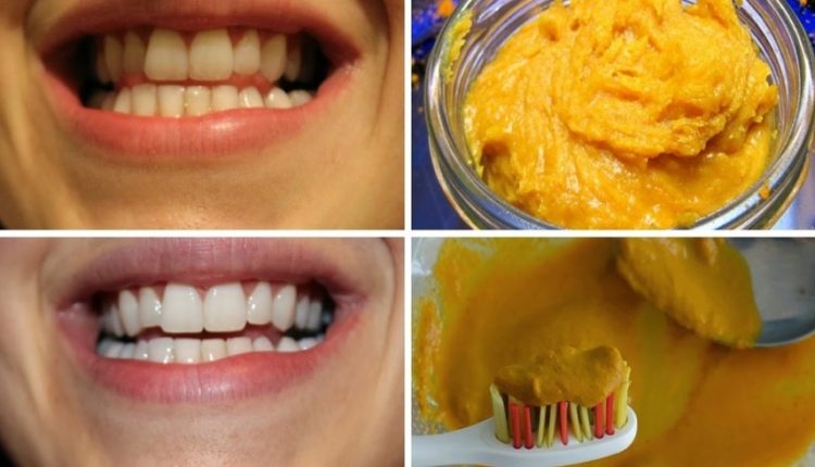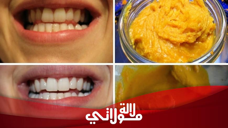 امزجي كل من ملعقة من الملح وملعقة من الكركم وملعقة من جوز الهند وقطرتين من زيت القرنفل مع بعضها البعض جيدا، و قومي بوضعها على فرشاة الأسنان ، وافركي الخليط على أسنانك لمدة 5 دقائق، كرري العملية مرتين في اليوم لمدة أسبوع وستلاحظين النتيجة.