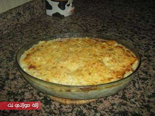 تصفى من الماء ثم تخلط مع الطون مفتت, نصف كمية صلصة البيشاميل و ترص نصف الكمية في صينية الكراتان
