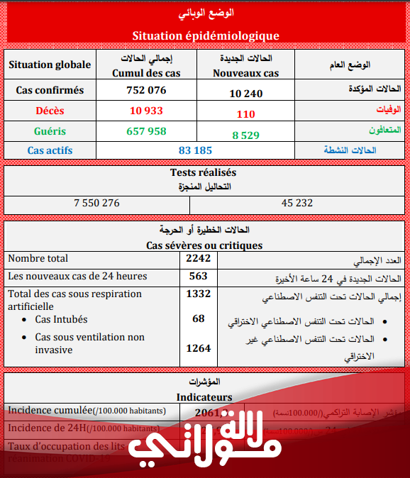وبلغ عدد الوفيات 10933 والمتعافون 657958 حالة، وبلغ العدد الإجمالي للمستفيدين من التلقيح إلى غاية اليوم 16240404 و 11389655 تلقوا الجرعة الثانية من اللقاح.