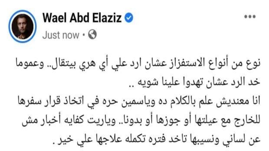 وأضاف وائل: “أنا معنديش علم بالكلام ده وياسمين حره في إتخاد قرار سفرها للخارج مع عيلتها أو جوزها أو بدونها..وياريت كفايه أخبار مش عن لساني ونسيبها تاخد فتره تكلمه علاجها على خير”.