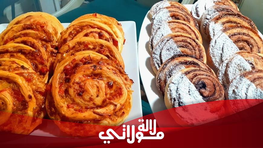 المكونات 600غ دقيق نصف كأس زيت ملعقتين كبيرة سكر ملعقة كبيرة ونصف خميرة الخبز خميرة الحلويات 7غ ملعقة صغيرة ملح بيضة ماء دافئ للعجن حشوة الحلوة ملعقتين كبار شوكولاطة الدهن ملعقة كبيرة حليب ملعقتين كبار جوز الهند حشوة المالحة حبة بصل حبة فلفل احمر وأصفر ملح إبزار ملعقة كبيرة مايونيز جبن مبشور.