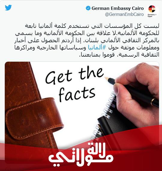 وجاء في بيان مقتضب للسفارة الالمانية ” ليست كل المؤسسات التي تستخدم كلمة ألمانيا تابعة للحكومة الألمانية. لا علاقة بين الحكومة الألمانية وما يسمي بالمركز الثقافي الألماني بلبنان”.