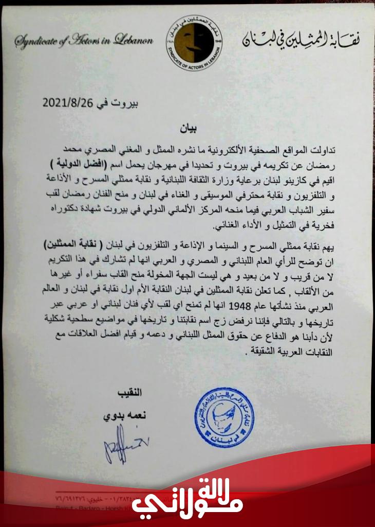وشددت النقابة، على أنها لم تمنح أي لقب لأي فنان لبناني أو عربي في تاريخها، مصرحة : “وبالتالي فإننا نرفض زج اسم نقابتنا وتاريخها في مواضيع سطحية شكلية، لأن دأبنا هو الدفاع عن حقوق الممثل اللبناني ودعمه، وقيام أفضل العلاقات مع النقابات العربية الشقيقة”.