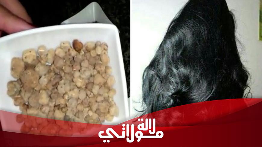 المكونات : كمية كافية حسب الشعر من عشبة تاكاوت محمصة ومطحونة + ملعقتين من الشاي الأسود المطحون + ملعقة من القطران الرقيق + ملعقة من عصير البصل + كمية من الماء لخلط المكونات.