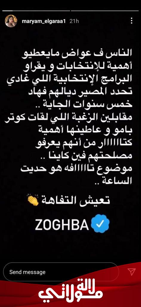 وقالت بطلة مسلسل بنات العساس “الناس ف عواض مايعطيو أهمية للإنتخابات و يقراو البرامج الإنتخابية اللي غادي تحدد المصير ديالهم فهاد خمس سنوات الجاية مقابلين الزغبة اللي لقات كوثر بامو و عاطينها أهمية کتاااااار من أنهم يعرفو مصلحتهم فين كاينا موضوع تااااافه هو حديت الساعة تعيش التفاهة ZOGHBA”.