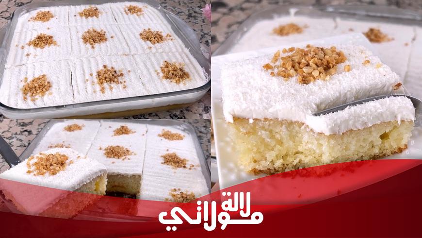 مكونات الكيك : 3بيضات كأس الا ربع من السكر 120غرام قبصة ملح 2اكياس من السكر الفانيليا كأس الا ربع من الزيت 150مل كأس من الحليب 200 مل كأس من السميدة الرقيقة 150غرام(سميد متوسط) كأس من الدقيق 120غرام كيس خميرة الحلويات 15غ شربات: كأس ونصف من الماء 300مل كاس من السكر 200غرام قطعة من الليمون طبقة الكريمة: نصف لتر من الحليب 4ملاعق من السكر 80غ ملعقتين ونصف من الدقيق 50غرام كيس سكر الفانيليا ملعقة صغيرة من الزبدة 15غرام علبة كريم شانتي 100غرام لتزين : جوز الهند.