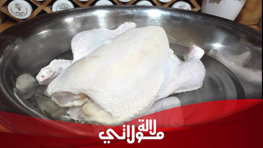 المكونات:الدجاج كميةٌ+كبيرة من ملح الطعام+كميةٌ قليلةٌ من الطحين+ماء و خل+غسل الدجاج: