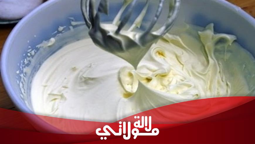 يمكنك سيدتي ان تعتمدي هذه المكونات بياض بيضتين حجمهما كبير. قالب زبدة غير مملح وخاص بالحلويات. ملعقتان صغيرتان من الفانيلا البودرة. نصف حبة ليمون مبروشة. كوب من السكر المطحون ناعماً. ضعي بياض البيض في إناء الخلاط الكهربائي، وأضيفي له كل من برش الليمونة الحامضة والفانيلا، ثم اخفقي المكونات بشكلٍ جيد حتى تحصلي على خليط كريمي. أضيفي السكر بشكلٍ تدريجي مع الاستمرار في خفق المكونات. أضيفي الزبدة، ثم اخفقيها جيداً حتى يتماسك الخليط. ضعي الكريمة في الثلاجة، ثم غطّيه جيداً، واتركيه إلى حين الاستخدام.
