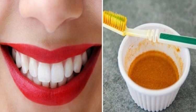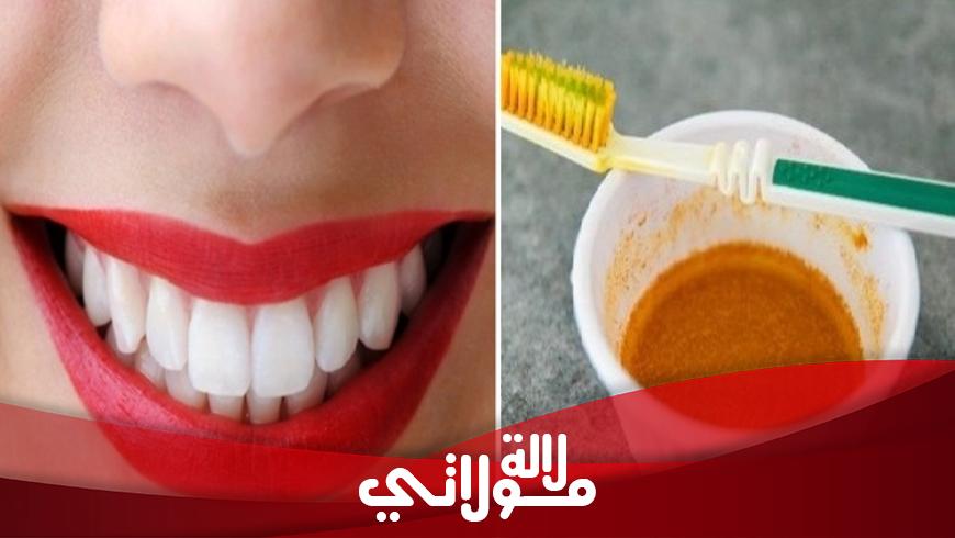 نمزج ملعقة صغيرة من زيت جوز الهند وملعقة صغيرة من مسحوق الكركم حتى نحصل على خليط متماسك ثم نضعه على الفرشاة و ننظف به الأسنان لبضع دقائق بعد ذلك نشطفه بمعجون الأسنان ، داومي هذه الطريقة للحصول على أسنان ناصعة البياض.