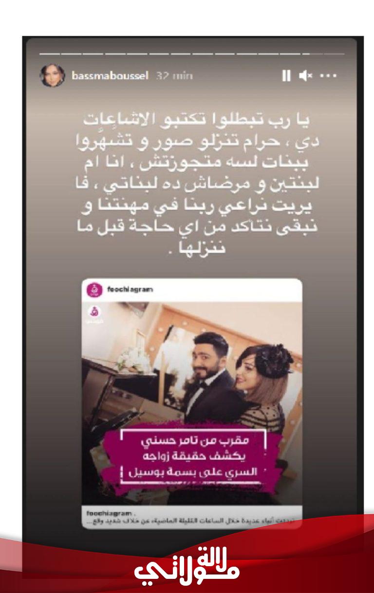 واختارت بوسيل خاصية الستوري على حسابها الرسمي بموقع تبادل الصور والفيديوهات انستغرام من أجل وضع حد لهذه الإشاعة ،وذلك من خلال تفنيذ خبر جرى تداوله بموقع “فوشيا” تحت عنوان “مقرب من تامر حسني يكشف حقيقة زواجه السري على بسمة بوسيل”.