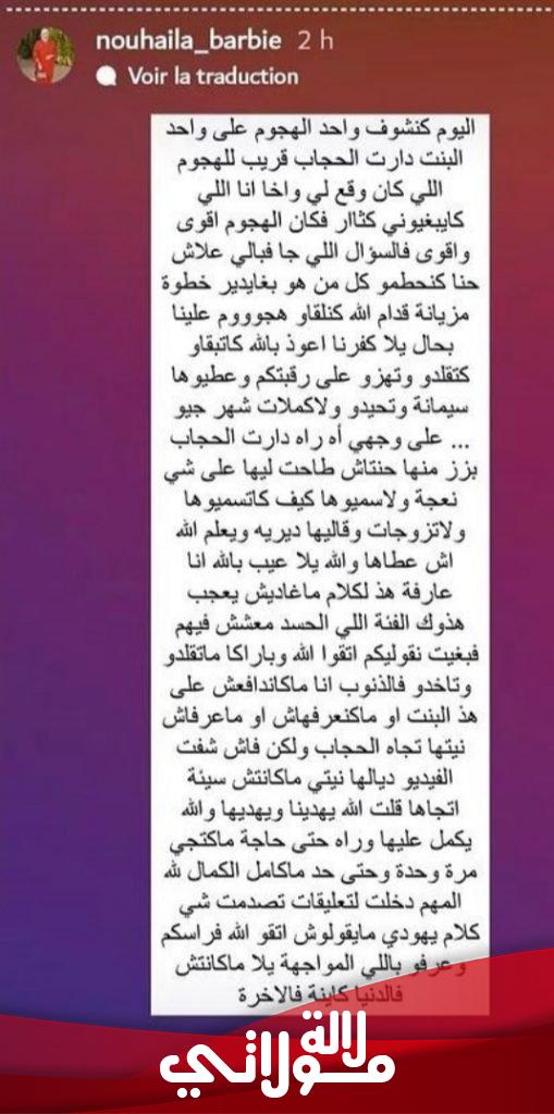 وأضافت” بغيت نقوليكم اتقوا الله وباراكا ماتقلدو وتاخدو فالذنوب انا ماكاندافعش على هذ البنت او ماكتعرفهاش او ماعرفاش نيتها تجاه الحجاب ولكن فاش شفت الفيديو ديالها نيتي ماكانتش سيئة اتجاها قلت الله يهدينا ويهديها والله يكمل عليها وراه حتى حاجة ماكتجي مرة وحدة وحتى حد ماكامل الكمال لله المهم دخلت لتعليقات تصدمت شي كلام يهودي مايقولوش اتقو الله فراسكم وعرفو باللي المواجهة يلا ماكانتش فالدنيا كاينة فالآخرة”.