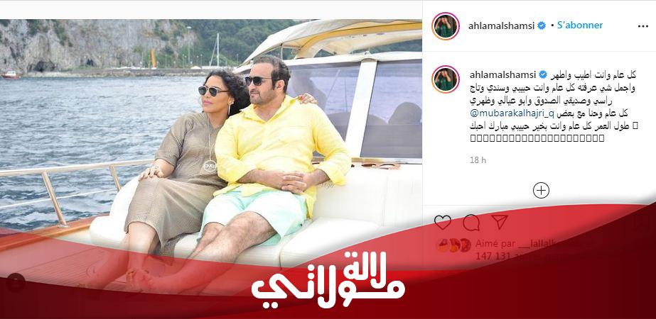واختارت أحلام حسابها الرسمي على موقع تبادل الصور والفيديوهات أنستغرام، من أجل معايدة زوجها، إذ عمدت على نشر صورة لها رفقته على ظهر أحد اليخوت، أرفقتها بتعليق جاء فيه :”كل عام وأنت أطيب وأطهر وأجمل شي عرفته كل عام وانت حبيبي وسندي وتاج راسي وصديقي الصدوق وابو عيالي وظهري”.