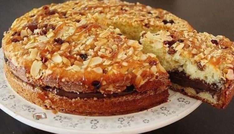 نزين الكيك بمكسرات مهروشة ( الكركاع + اللوز + الزبيب + الكاوكاو ) ونضعه في الفرن .