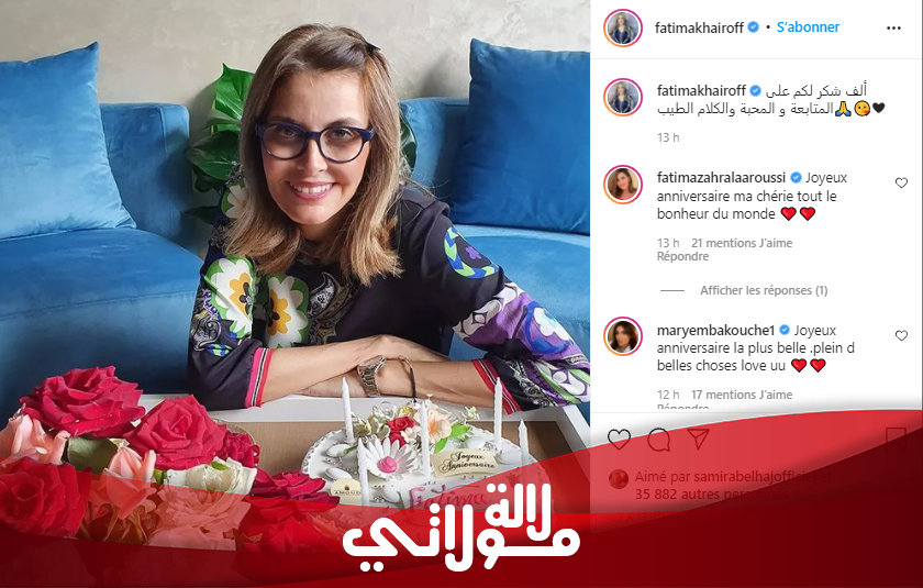 كما عايد الفنان سعد التسولي زوجته فاطمة خير عبر حسابه الرسمي إنستغرام قائلا: »عيد ميلاد سعيد حياتي »، وحظيت الصورة بإعجاب الآلاف من متابعي خير، متمنين لها الصحة والعافية.