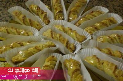 ثم ناخذ سكين ونقطع الى شرائط طويلة ويكون عرضها 2 اصابع ونقطع تلك الشرائط على طول الاصبع وناخذ كل شريط صغير ونلويه 2 لويات ويصفف في اللاطة ويدخل الى الفرن وعند خروجها تسقى بالعسل وتزوق باللوز ايفيلي مثل الصورة