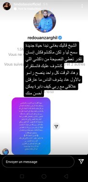 وعلقت هند على الرسالة بالقول:”الشيخ قاليك بغاني نبدا حياة جديدة سمح ليا ولكن مكانشوفكش إنسان تقدر تعطي النصيحة من داكشي اللي كنشوف عليك فانستغرام”.