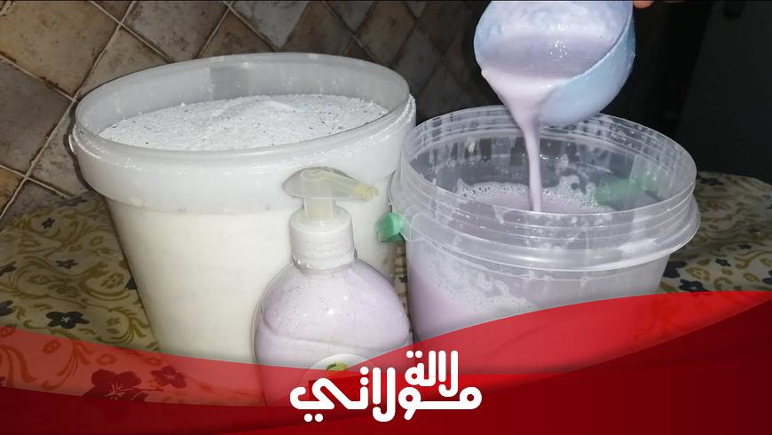 المكونات:لترين ماء مغلي + 1.5 لتر ماء بارد+قشور ليمون+عصير 4 ليمونات+صابون حجرة+ 2 كؤوس من الصابون السائل المخصص للأواني+ملعقة بيكاربونات الصودا