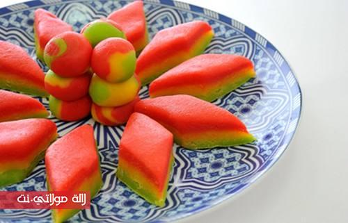 نُخلط دقيق اللوز مع السكر كلاصي والفانيليا وماء الزهر في الخلاط الكهربائي. – يُضاف بياض البيض،ويخلط الخليط جيدا – يُقسم العجين إلى ثلاث أقسام، يوضع كل قسم في وعاء ويُضاف لون مختلف لكل قسم، مع العجن جيداً باليد حتى تتوزع الألوان تماماً. -نفرد العجين بالمدلك فوق البوتاجي مرشوش بقليل من النشا، على شكل مستطيلات متساوية. – وتوضع الثلاث مستطيلات فوق بعضها البعض مع الضغط باليد حتى تلتصق جيداً، مع التخلص من الأطراف الزائدة بواسطة سكين – تُقطع إلى شكل مُعيّن (أو أشكال أخرى حسب الرغبة)، ونضعها في طبق التقديم. اقتراح آخر للتقديم – يُكور كل جزء من لون ، للحصول على كرات متداخلة الألوان.