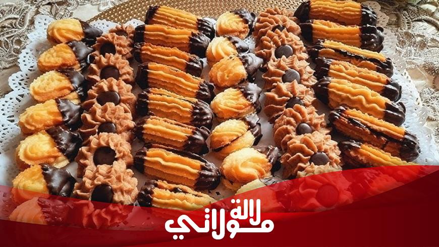 مقادير العجين: 250 غرام زبدة 01 كاس زيت 01 كاس سكر صقيل 01 كاس نشا الذرة (مايزينا) قبصة ملح راس ملعقة صغيرة فاني بودرة 450 غرام دقيق ابيض مقادير النكهات: الشكل الاول: 01 كيس قهوة سريعة الذوبان 01 ملعقة كبيرة حليب القليل من الدقيق الشكل الثاني: 01 ملعقة كبيرة كاكاو الشكل الثالث بدون اية اضافة لتزيين الحلويات: الشكل الاول: كناش شكلاط شكلاط اسود الشكل الثاني: شكلاط اسود الشكل الثالث: كناش شكلاط شكلاط اسود.