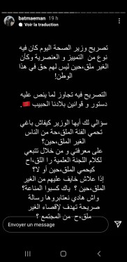 ونشرت بطمة الصغرى تدوينة عبر حسابها الشخصي على موقع التواصل الاجتماعي إنستغرام، جاء فيها: “تصريح وزير الصحة اليوم كان فيه نوع من التمييز و العنصرية وكأن الغير ملقحين ليس لهم حق في هذا الوطن !”.