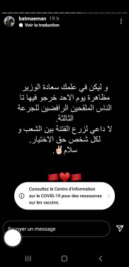 واختتمت المتحدثة ذاتها كلامها قائلا: “ليكن في علمك سعادة الوزير مظاهرة يوم الاحد خرجو فيها تا الناس الملقحين الرافضين للجرعة الثالثة لا داعي لزرع الفتنة بين الشعب و لكل شخص حق الاختيار”.