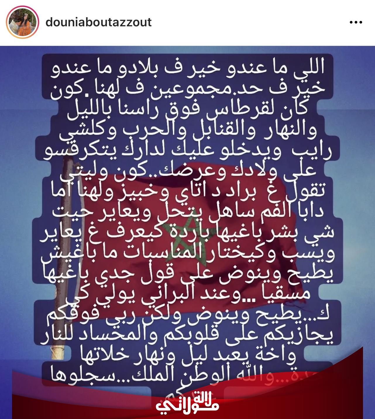 تقاسمت الممثلة دنيا بوطازوت على حسابها الرسمي على إنستغرام، تدوينة وجهت عبرها رسالة إلى الغيورين عن الوطن.