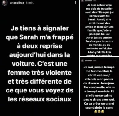 ونشر الباز عدة تدوينات عبر حسابه الشخصي على موقع التواصل الاجتماعي إنستغرام، قبل أن يحذفها بدقائق، وجاء فيها: “أريد أن أعلمكم أن سارة ضربتني مرتين اليوم أثناء تواجدنا بالسيارة”، مضيفا “إنها سيدة عنيفة ومختلفة عما ترونه عبر منصات التواصل الإجتماعية”.