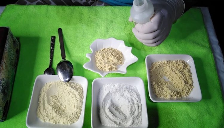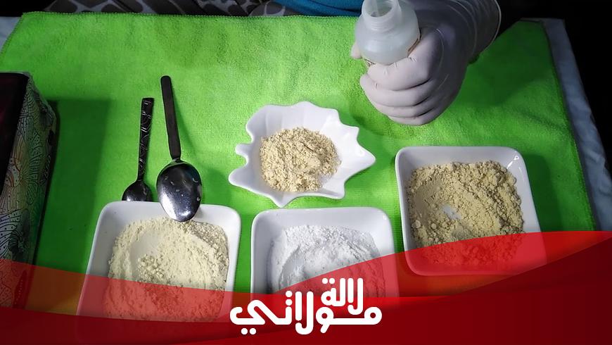 المكونات : ملعقة كبيرة من الخزامى المطحونة + ملعقة من الزعتر المطحون + ملعقة من الغاسول الأخضر + ملعقة من بودرة الزاز + نصف ملعقة من بودرة الودعة + ملعقة من النيلة البيضاء + حبات من الخردل المطحون + عصير الليمون حسب الكمية.