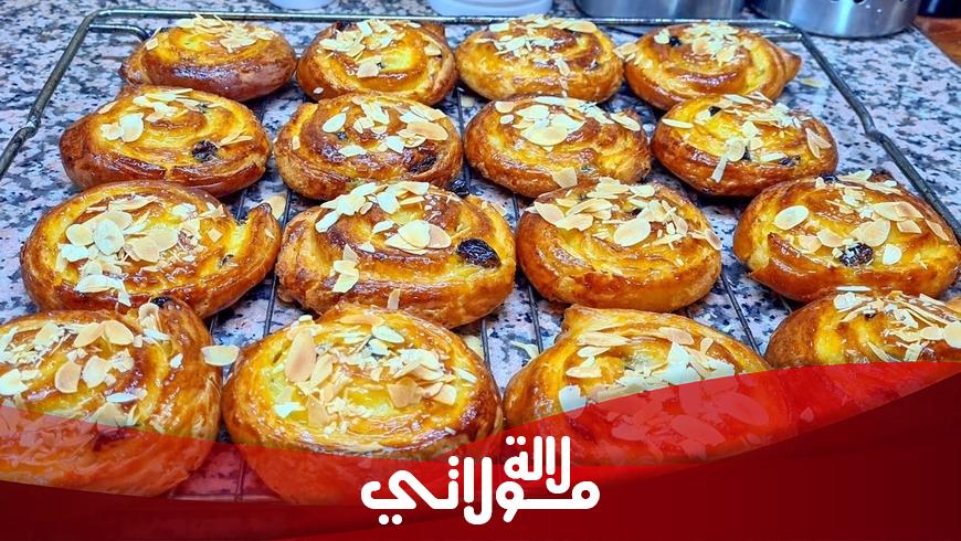 المقادير 6 كؤوس دقيق ثلث كأس سكر ثلث كأس زيت بيضة ملعقتين ك بودرة الحليب ملعقتين ك خميرة نصف ملعقة ص ملح حليب لجمع العجين تقريبا كأسين وربع 250 غ زبدة كريم باتيسيير زبيب مربى وناباج ورقائق اللوز للتزيين.