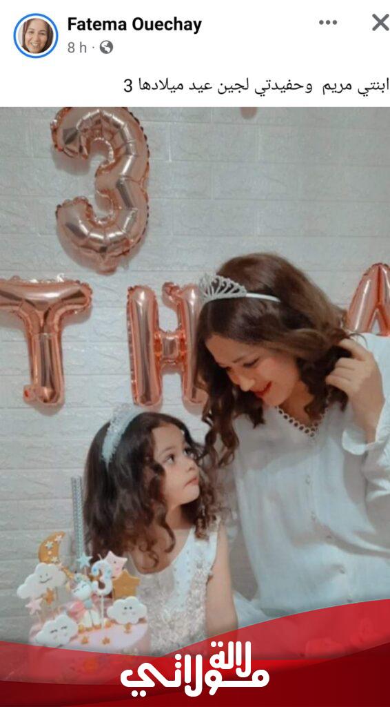 شاركت الفنانة القديرة فاطمة وشاي متابعيها عبر حسابها الرسمي على الموقع الأزرق “فايسبوك” صورة لابنتها وحفيدتها التي تحتفل بذكرى ميلادها الثالثة.