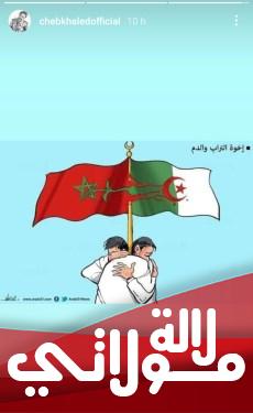 وشارك الشاب خالد صورة لعلمي المغرب والجزائر بجانب شخصين يقومان بحضن بعضهما البعض وعلق قائلا:” إخوة بالتراب والدم”.