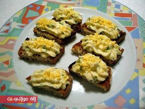 نقسم البيضة الى نصفين و نزيل الاصفر ونخلطه جيدا مع المايونيز و البقدونس و الثوم لقصبي نفرغ الخليط في جيب الحلواني و نملأ به ابيض البيض