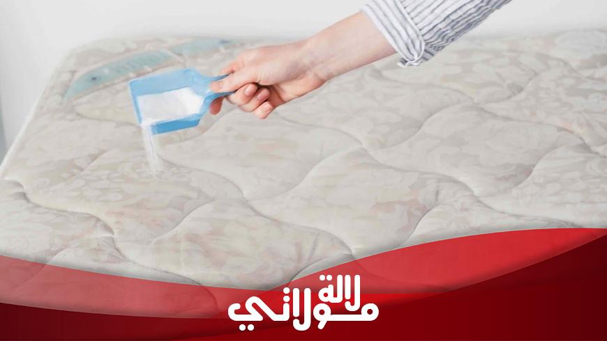 يمكنك سيدتي أن تقومي بخلط محلول يحتوي على 3 ملاعق من بيكاربونات الصودا مع كمية من عصير الليمون وقطرات من أي زيت عطري إلا أنه يفضل اعتماد زيت اللافندر أو الخزامى، اخلطي هذه المكونات جيدا ثم قومي برش المرتبة أو السرير سواء كان سريرك أو سرير الأطفال بهذا المحلول ثم اتركيه إلى أن يجف بعدها خذي منشفة جافة وامسحي بها مع فتح النوافذ ثم خذي كمية من بودرة الأطفال ورشي بها المرتبة قبل تغليفها بالشرشف الخاص بها ، وهذه الخلطة تصلح أيضا للشراشف والوسائد وحتى السجاد الخاص بغرفة النوم.