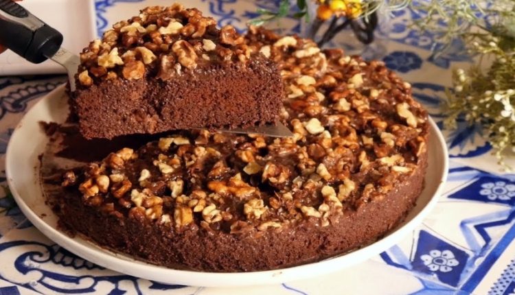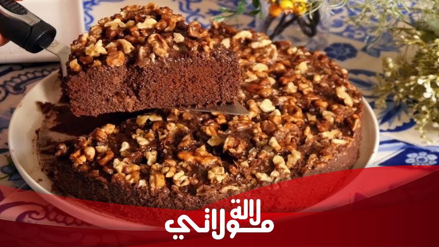 من مطبخ امينة المراكشية / المقادير: 4 بيضات 1 + 1/4 كوب سكر – 180 غرام 1 كيس خميرة الحلويات 1 كيس فانيلا 1 + 1/2 كوب دقيق – 140 غرام 3 ملاعق كبيرة كاكاو – 21 غرام 1/2 كوب حليب – 100 مل 1/2 كوب زيت نباتية – 130 مل* مقادير صوص: 1,5 كوب حليب – 300 مل 70 غرام قطع الشكلاط 2 ملاعق كبيرة كاكاو – 14 غرام 3 ملاعق كبيرة سكر – 60 غرام 1 كوب كريمة سائلة – 200 مل الجوز