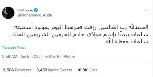 وشارك محمد عبده الخبر السعيد مع متابعيه بحسابه الخاص على موقع “تويتر”، وغرد قائلا: “الحمد لله رب العالمين رزقت فجرَ هذا اليوم، بمولود أسميته سلمان، تيمنًا باسم مولاي خادم الحرمين الشريفين الملك سلمان حفظه الله”.