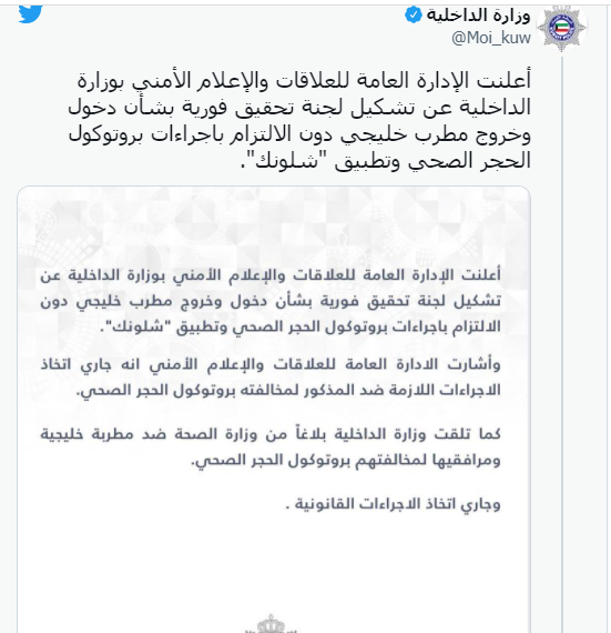 وردت وزارة الداخلية الكويتية على الموضوع، دون ذكر أسماء الفنانين، وطالبت فتح تحقيق بـ”دخول وخروج مطرب خليجي”، حيث أعلنت الإدارة العامة للعلاقات والإعلام الأمني عن تشكيل لجنة تحقيق فورية بشأن دخول وخروج مطرب خليجي دون الالتزام باجراءات بروتوكول الحجر الصحي وتطبيق “شلونك”.