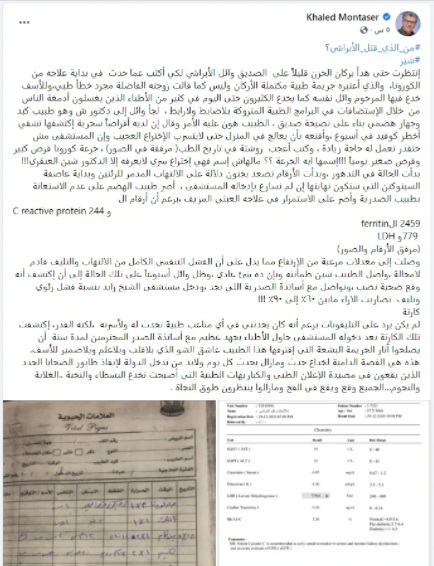 وواصل: “اسمها إيه الجرعة ؟؟ مالهاش اسم فهي اختراع سري لا يعرفه إلا الدكتور شين العبقري!!! بدأت الحالة في التدهور، وبدأت الأرقام تصعد بجنون دلالة على الالتهاب المدمر للرئتين وبداية عاصفة السيتوكين التي ستكون نهايتها إن لم نسارع بإدخاله المستشفى، أصر طبيب الهضم على عدم الاستعانة بطبيب الصدرية وأصر على الاستمرار في علاجه العبثي المزيف، برغم أن أرقام التحاليل المخيفة، والتي وصلت إلى معدلات مرعبة من الارتفاع مما يدل على أن الفشل التنفسي الكامل من الالتهاب والتليف قادم لامحالة”.