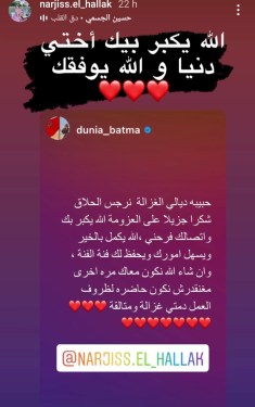 وتابعت:” الله يكبر بيك واتصالك فرحني الله يكمل بالخير، ويحفظلك فنة الفنة، وان شاء الله نكون معك مرة اخرى مغنقدرش نكون حاضرة لظروف العمل”.