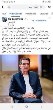 وجاء في التدوينة: “بعد اتصال مع الصديق والفنان نعمان لحلو هذا الصباح، بخصوص شائعة الأغنية/ الأنشودة، عبر لي عن استغرابه الشديد بهذا الخصوص، وأكد على كونه لا يتوفر على أي حساب بالأنستغرام. بالإضافة إلى كونه في حالة حداد بعد وفاة أخيه عالم الذرة : فؤاد لحلو”.