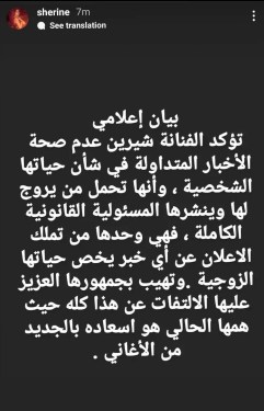 وأضاف: “هي وحدها من تملك الاعلان عن أي خبر يخص حياتها الزوجية، وتهيب بجمهورها العزيز عليها الالتفات عن هذا كله حيث همها الحالي هو إسعاده بالجديد من الأغاني”.