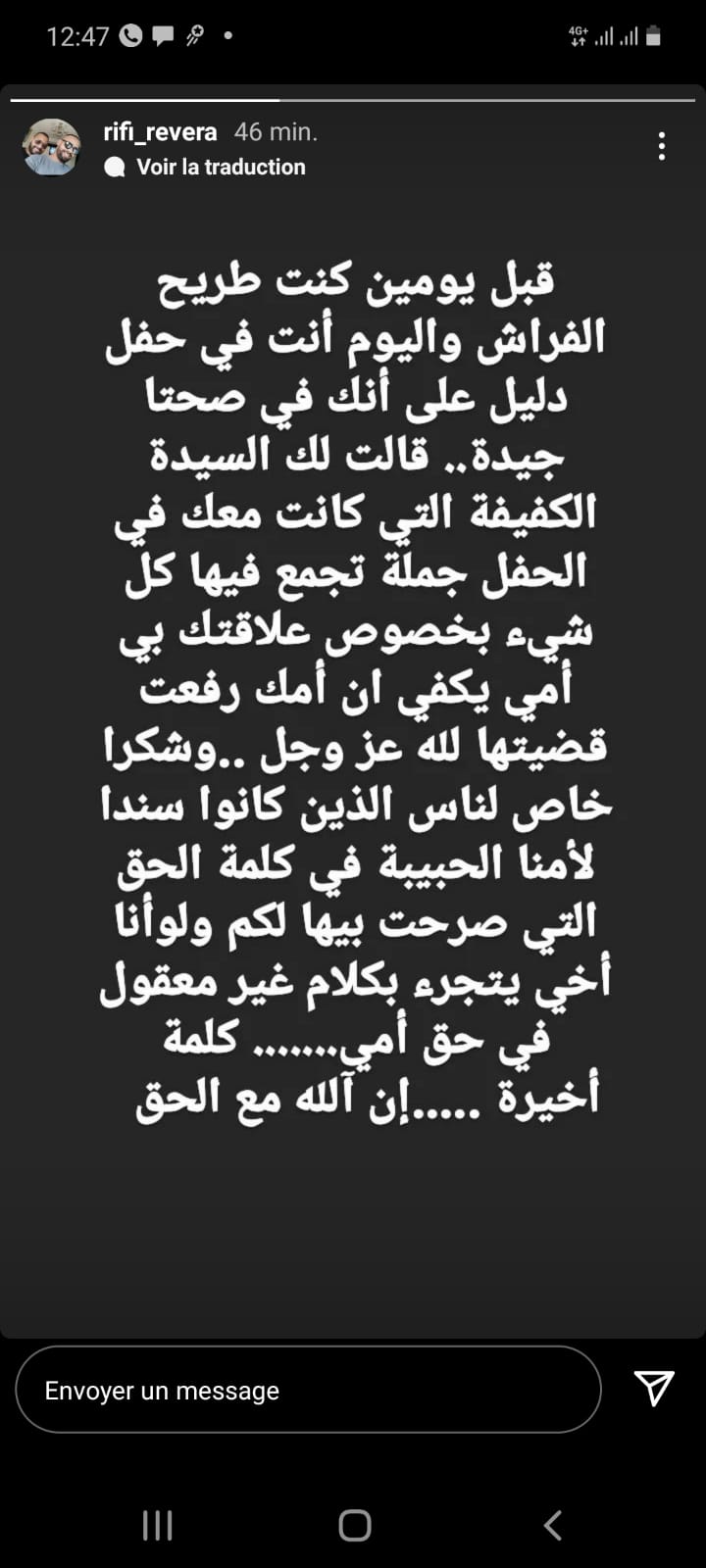 وكتب الشقيق التوأم للفنان محمد الريفي عبر السطوري المنشورة كلاما قال من خلاله ” : قبل يومين كنت طريح الفراش واليوم أنت في حفل دليل على أنك في صحة جيدة، قالت لك السيدة الكفيفة التي كانت معك في الحفل جملة تجمع فيها كل شيء، بخصوص علاقتك بأمي يكفي أن أمك رفعت قضيتها لله عز وجب..و”