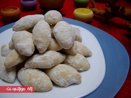 نمد العجينة تقطع دوائر ،نضع وسطها كويرة من حشوة التمر ونشكلها مثل الهلال مثل الصورة بعد إخراجها من الفرن وهي ساخنة تفند في السكر صقيل